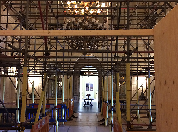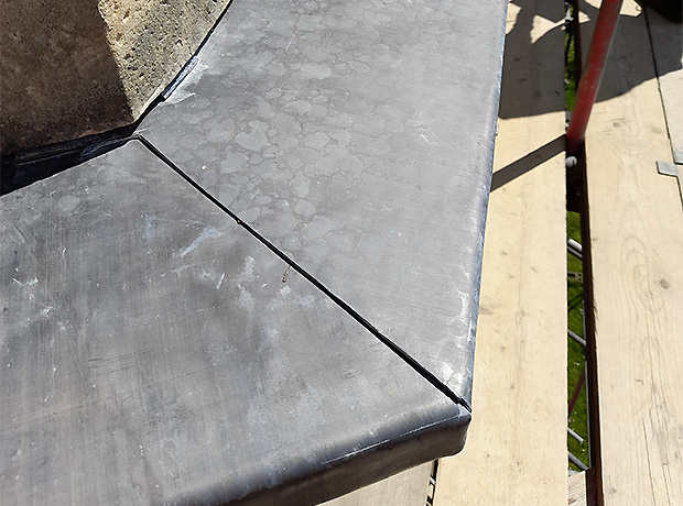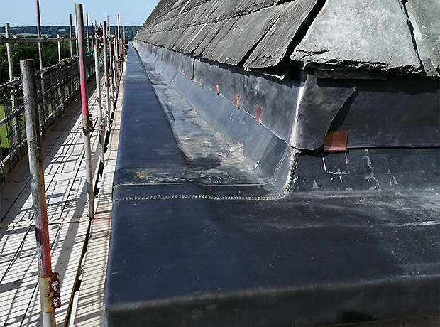 Once the scaffolding was erected around the outside of the West Wing the team worked their way around the building removing the old lead off the façade. This was then replaced with 120 metres of new while at the same time addressing any damage to the original stone cornice. The whole process was systematically choreographed, not only because of the unpredictable British weather, but so the original slate tiles could also be carefully lifted one at a time to allow the new lead to seamlessly blend into place here at the same time