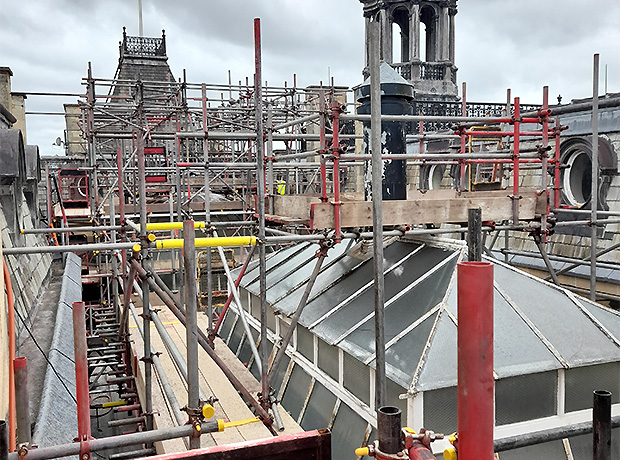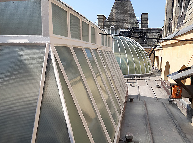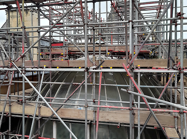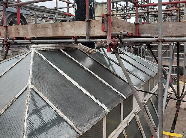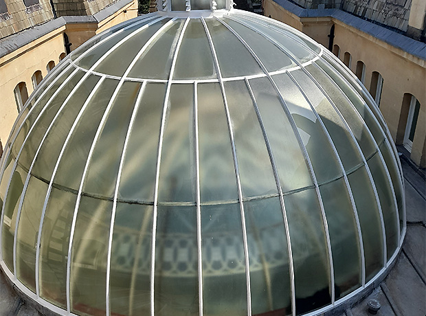 The Glass Dome and the Lantern Roof are beautiful examples of the architectural techniques used in that Victorian era; however, both needed important restoration. Once scaffolding had been carefully erected inside the building to create a protective floor against possible falling debris and new access ladders installed to the inner roof space, only then could the refurbishment of both structures begin in earnest. On the Dome, the heritage putty was replaced across the whole body and then repainted three times to bring it back to its original splendour. While on the Lantern roof any broken glass panels were replaced before the same refurbishment procedures continued as with the Dome.
